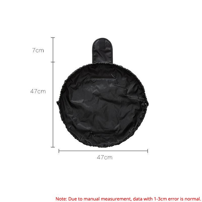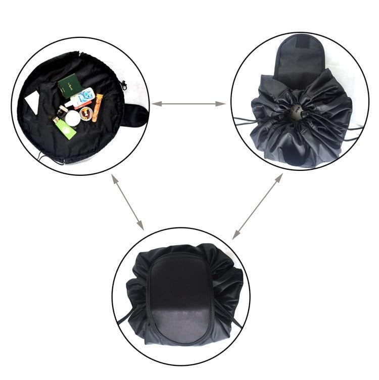 Our Travel Make Up Wrap Bag (22") is a handy, cosmetic tote that allows easy access to all of your cosmetics at once and clean up takes just seconds! No more digging around in one of those traditional, black hole, make-up bags searching for what you need. When fully open, the raised lip keeps makeup and brushes from rolling off the counter. It's machine washable and wipeable! Perfect for use at home or while away! Now you can do your daily makeup routine at home, the gym, in your office or wherever. Just place the bag on a clean dry surface, open it and you're set! When done, simply pull the drawstring cord, the bag cinches completely closed and you're ready to go! Easy to store or travel with, just pack the bag in your suitcase or tuck it into your overnight bag. It conveniently fits anywhere! It's a smart and easy 4-in-1 solution; clean surface, quick cleanup, carryall and storage.